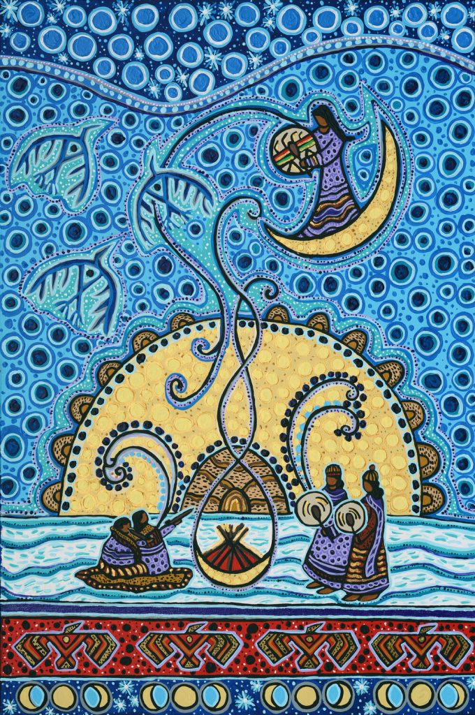 La artista mestiza Leah Marie Dorion comparte las enseñanzas de la luna a través de su detallada pintura y poesía. Importantes para la sabiduría de las mujeres indígenas y el conocimiento cultural tradicional, las enseñanzas sobre la luna honran a las mujeres como dadoras de vida vitales. La luna, conocida por muchos Ancianos como “Nuestra Abuela”, marca el paso del tiempo. Proporciona sabiduría, confort, protección y fuerza desde su posición sobre nosotros en el cielo. A través de su trabajo, Leah Dorion restaura las enseñanzas de las mujeres indígenas y nos conecta a los ciclos de las leyes naturales sagradas y curativas.